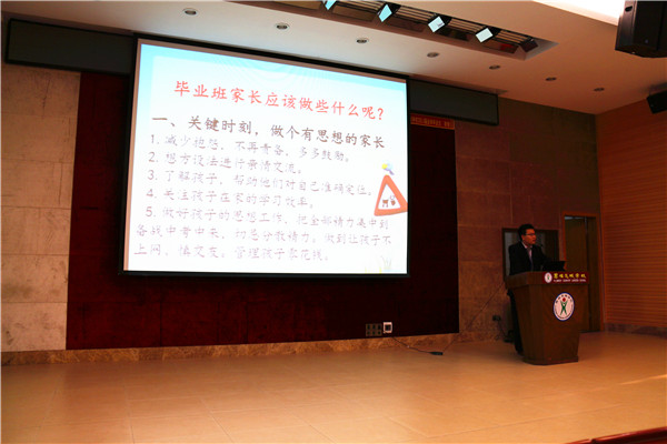 首先,贺校长发表了热情洋溢、充满诗意的讲话。讲话分为两个方面:一是感谢伟大的祖国,为我们创造了一个伟大的时代,感谢所有同学在期末的统考中用优异的成绩为学校争光,感谢家长百忙之中前来参加家长会,感谢初三年级这一优秀团队。二是强调中考是场伟大的战役,希望学校、家长和同学们齐心协力,共创辉煌。