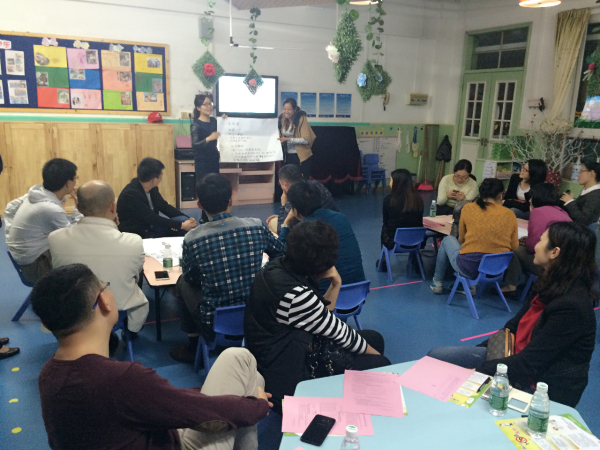为了孩子拥有远离手机等电子产品的趣味童年,活动最后环节设置了“民间趣味游戏大征集”,家长分组讨论童年时期的趣味游戏,并记录在纸上,最后由组员分享本组的成果。此活动环节将活动推向了高潮,家长们迫不及待地分享、展示自己童年的趣味游戏,将其一一记录在纸上,我们将家园共同引导孩子进行游戏,尝试民间游戏,体验不一样的游戏乐趣。