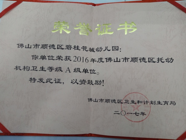碧桂花城幼儿园荣获“2016年度佛山市顺德区托幼机构卫生等级A级单位”称号