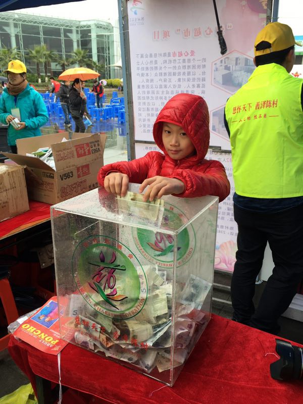 在家委会的精心组织下,同学们很快在主会场的广场上忙开了:他们有的三个一组,五个一伙在地板上装拼小风车,有的把小风车拿到人群中义卖。很快,一元、五元、十元、、、、、、一双双小手把义卖攒回来的善款投进了善款箱,为陈村的慈善事业奉献了爱心。