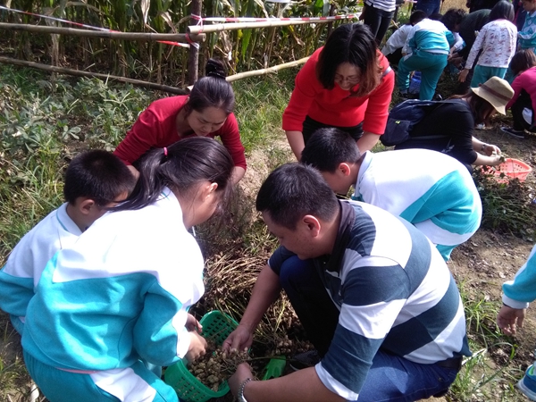 早上八点半,孩子们和家长在学校门口集合,一起前往高明牛扣村。车上欢声笑语,歌声荡漾。车外沁人秋光、风轻云淡,阳光正暧的天气无疑让这次秋游增添了许多愉悦的乐符。大约一个小时,一行人来到目的地。这里树木葱郁,稻穗金黄,阳光明朗,天空湛蓝,不禁让人心旷神怡,让人有一种说不出的高兴。短暂休息后,大家分工合作,有的搭帐篷、搬台凳、拾柴火,有的挖花生、洗青菜忙得不亦乐乎。很快炊烟袅袅升起,饭香阵阵扑鼻。西红柿炒鸡蛋,青瓜炒猪肉,可乐鸡翅……家长们的厨艺露一手,吃得孩子们都竖起了大拇指。