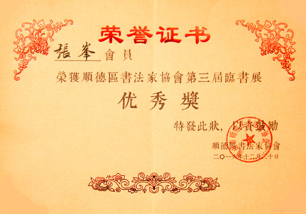此届临书展是顺德书法家协会面向全区书法爱好者和区书协会员全面征稿的一次书法展览的盛事。得到众多书法爱好者的关注并积极投稿,此次展览共收到稿件二百多件,评审出入选作品七十件,并从入选作品中评出优秀作品三十件。我校张峰老师的书法作品荣获优秀奖(最高奖项)。