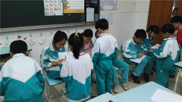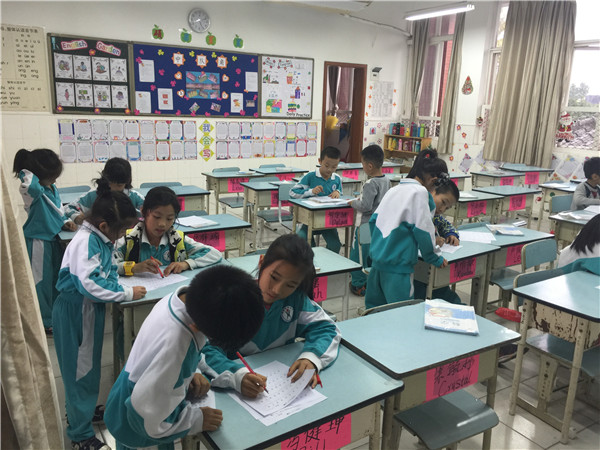 此次参赛选手是全体一年级学生,考官则是在四年级的学生。小考官们可有备而来,手持考卷和红笔,秉着公平公正的原则,准时走进相应教室。一年级的考生们,一个个自信满满,跃跃欲试的在门外候考。整齐的候考队伍中,也许有些紧张,也许有些不安,但更多的是期待自己大显身手。别看他们年纪小,比赛的时候可认真了,知识在大脑里飞速运转,眼睛紧盯试卷,小手指着字,努力的喊出每个汉字的名字。