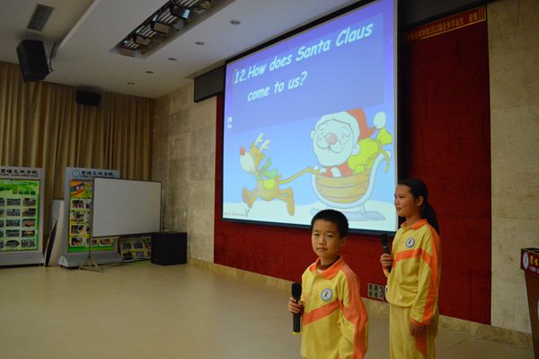 随后,便是有趣的问答游戏环节,六一班主持人就西方人过圣诞节的有关习俗向大家提问。答对的同学即可获得礼物一份。这一环节更把当天的圣诞活动推上一个高潮!知道答案的同学立刻举手抢答。小主持每一次的发问,都有在下的同学们积极回应,使得场内气氛更加活跃。