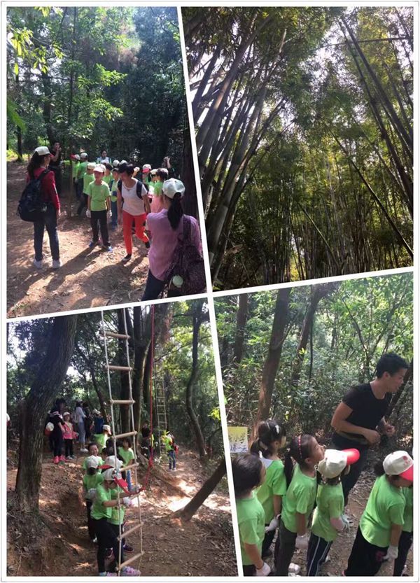 穿过了迷宫,来到了山顶的――绳梯爬树直降。只见用绳子做成的梯子高高的挂在树上,一阵风吹来梯子不断地摇晃着,仿佛在对孩子们说:“哈哈……看看谁能征服我!”挑战时刻到了,孩子们都勇敢地往上爬,互相鼓励,互相加油,当他们降落的那一刻,每个人的脸上都露出了自信的笑容。接下来的深林小猎人和草原飞鹰行动中,孩子们一个个信心满满,仿佛每个都化身超人,充满了能量,有些玩了两次还意犹未尽。行走山间,沿路散落着不知名的小花飘来阵阵花香,郁郁葱葱的松树结满了松果。有的孩子惊喜地捡起了松果,有的孩子用探究的目光看着周围不知名的植物,他们不断地发现“新事物”,充满好奇心的他们讨论着,思考着……山林间留下了他们一串串问号和欢笑声。