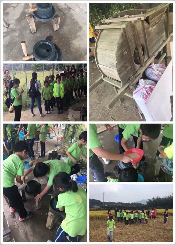 午后,新一轮活动开始了。三人一组的磨豆浆,大家分工合作,你放豆子我推磨,配合得好默契啊!看着米黄色的豆浆从石磨源源不断流出,孩子们激动的大叫起来:“有豆浆喝啦.,有豆浆喝啦……”