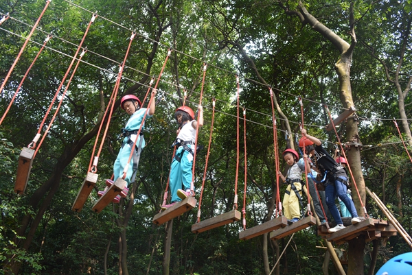 接下来开展的是重头戏,体验式户外拓展活动――森林探险。在家长陪伴和鼓励下,孩子们穿过重重风格各异的关卡,感受树上攀爬与林间穿越的刺激。这项活动不仅考验孩子们的肢体平衡,空间感和逻辑思维,还能在挑战中锻炼体能,同时学会换位思考。有胆子大的孩子先拔头筹,立马就能在教练的指导下迅速开始冲关,有的在家长的鼓励下渐入佳境,也有的紧张和害怕,发出尖叫。看到孩子们的表现,家长们也“不寻常”起来:或呐喊,或指挥,或焦急,或紧张,仿佛自己就是孩子的角色。在爱的感召和鼓励下,孩子们都顺利通关,活动中的每一个画面都凝聚了浓浓的亲情关爱,传递着深深的友谊。