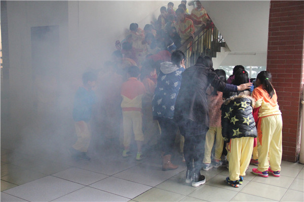 4:30分,随着一阵急促的警报声响起,教学楼楼梯口立刻燃起浓浓烟雾,紧接着广播传出“火灾疏散演习现在开始,请大家有秩序地迅速撤离”的口令,各班同学在老师的带领下井然有序、安全迅速地沿预定路线撤离。同学们用湿毛巾掩住口鼻,弯着腰身,注意不喧哗,不推搡,按预计的时间到达足球场集中,体验到了一次火灾疏散场景。