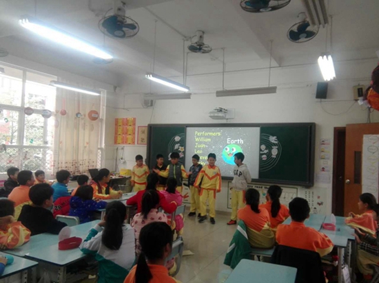 五(1)班本学期UOI探究主题是围绕着Space一主题而开展的。而这次学生UOI成果展示课全程由学生自己主导,在小主持人引导下,各小组分演小短剧。现场中各小组分演的短剧内容颇有趣味性在短剧中穿插问答活动,并且在星球配对游戏中,加入了学生家长互动的环节,家长参与到活动中去让整个活动不仅仅是学生自己的表演。随后,带入到关注地球的话题中去。我们应该要好好保护地球的纪念。学生家长们一同探讨,发表保护地球的意见。展示课结束前外教老师Mr. Bruce给同学们还做了最后的总结。