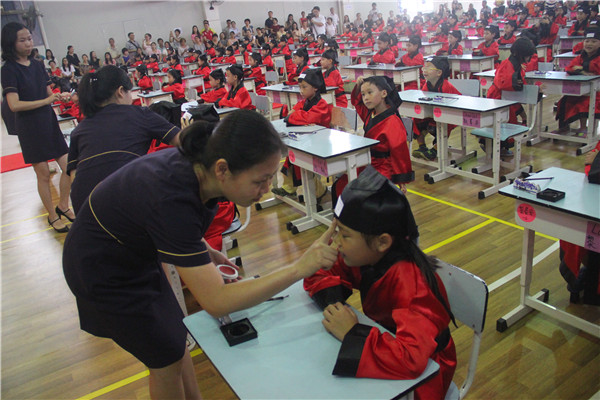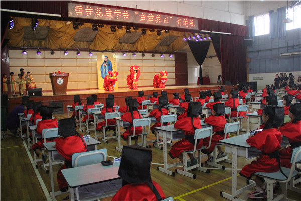 我校秉承古代民间习俗文化精神,加入新时代元素,于2016年9月23日下午,为一年级新生举行开笔礼仪式。目的就是借以庄重的仪式,为刚入学不久的一年级新生打开中华传统文化的大门,走入经典文化的殿堂,真正感受到入学是人生中的一件大事,是开始学习,是走向成才的起点。