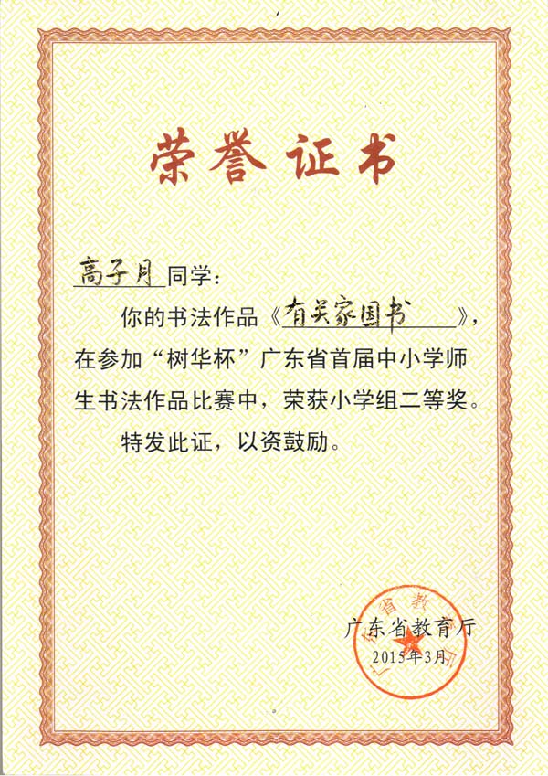 高子月同学荣获“树华杯”广东省首届师生书法大赛小学组广东省二等奖