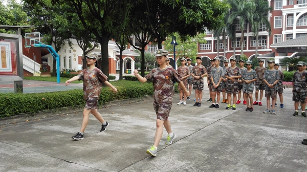 赤日炎炎,但学子们士气高昂,精神抖擞地参与到了训练当中。在教官亲切的关怀和严格训练下,在短短的一天里,立正、稍息、齐步走、解散、集合等预定训练科目已初见成效。教官教得科学严格,学生学得认真勤奋,各班精神饱满,步伐矫健,方队整齐,口号响亮。