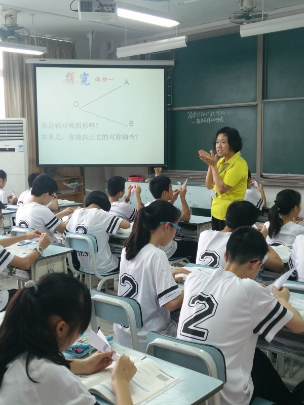 魏转云老师在七(2)班执教的是《角平分线的性质》,这节课知识点多,容量大,前后知识联系紧密,魏老师在备课方面做了精心的准备,既突出了重点,又巧妙的突破了难点,整节课以学生探究为主,动手折叠,动手画图,亲自发现,亲自验证,并让学生联系前后知识,从理论的高度去说明发现结论的正确性,要求学生知其然还要知其所以然。整节课形式多样,有独立思考抽签回答的环节,有自学成果展示环节,还有小老师环节,给学生以充分展示的机会,极大的调动了学生的积极性与热情,整个课堂精彩不断。