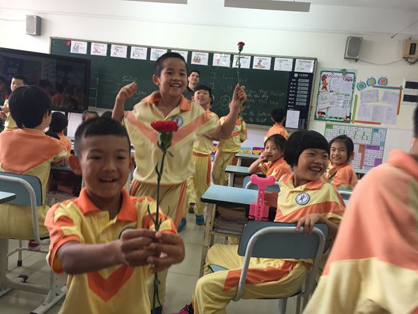 从Bryan的课堂,我们感受最深的就是“世界上最优秀的演员莫过于教师”。Mr. B用灵活多样的方式,引导学生进行不同角色的扮演。课堂热身活动中,Bryan买来鲜花,利用5月20日这个谐音“我爱你”的特别日子,引导孩子为家长献上鲜花并表达自己愿意为家人做的事情,那时候,他们是贴心的小棉袄;课堂中,教师在孩子们例举出的动物名称基础上加以分类,讲述worm-blooded animals和cold-blooded animals的特征,并向他们展示蜥蜴,猜想蜥蜴身体部位的用途,这时候,他们是好奇的探究者;课堂活动中,孩子们根据老师的指引,去家长处获取相应的卡片,这时候,他们是热情的参与者……而站在前面的这个运筹帷幄、活力四射的外教,是本次活动的总导演,在他的领导下,孩子们不但充分锻炼了英语口语,也提高了他们的沟通表达能力。