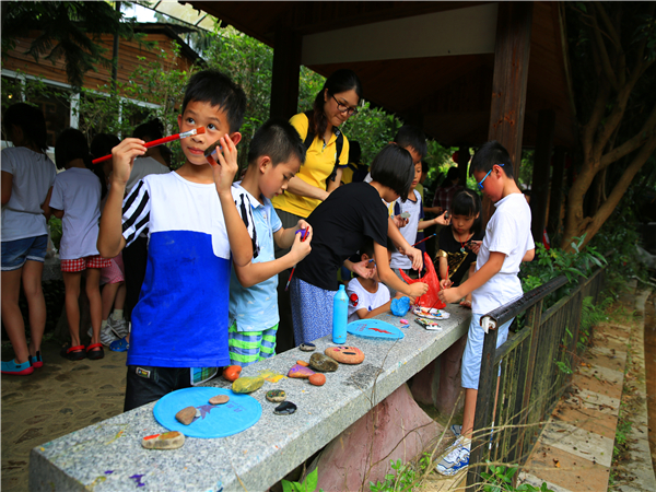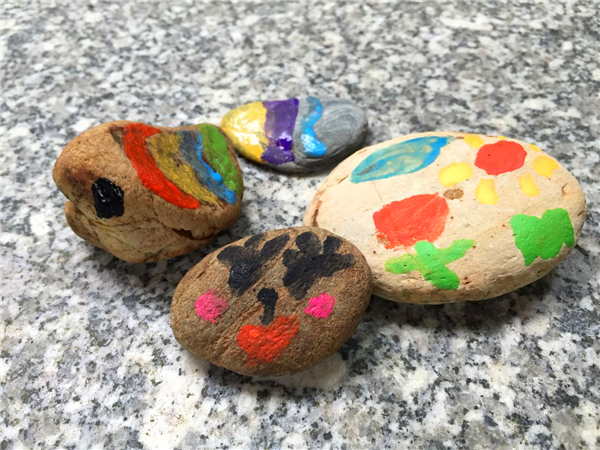 孩子们顾不上溯溪的疲倦,又投入到“画岩”活动,凭着对溯溪的感觉、感受,在小小石头上勾画出精美的图案,表达了自己对未来的美好憧憬。