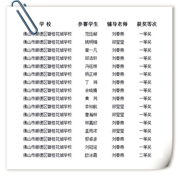 我校五年级16名同学代表碧桂花城学校参加了决赛,15人获得一等奖,1人二等奖,一等奖获奖比例高达94%。我校有10名同学进入了全市前100名,其中范珏郗同学更是获得全市第六名的好成绩。如此优异的整体成绩在全区乃至全市都是首屈一指的。