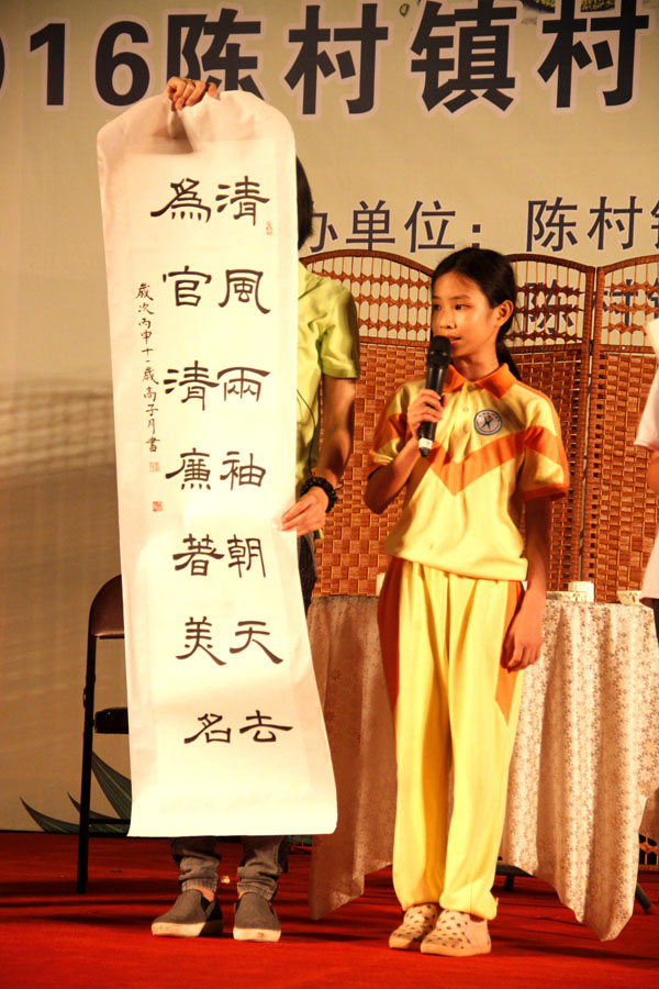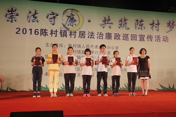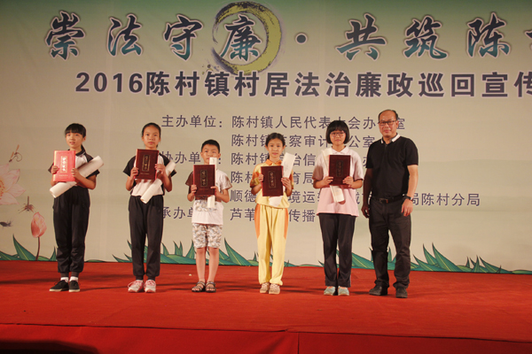 6月3日晚19:00,2016年陈村镇“学法律、讲法治、守法规”中小学法治廉政征文、书法创作比赛颁奖典礼在镇政府镇西广场隆重举行。
