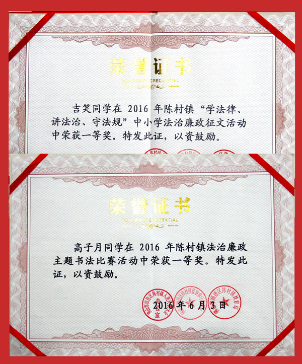 2016陈村镇中小学法治廉政征文比赛评奖结果