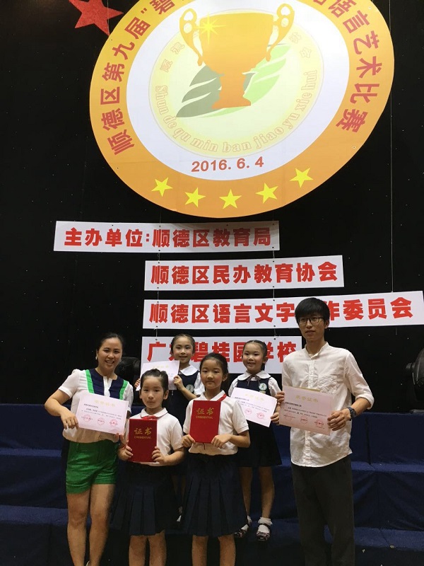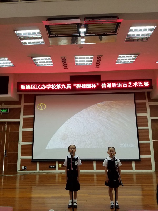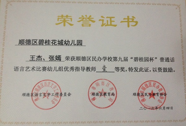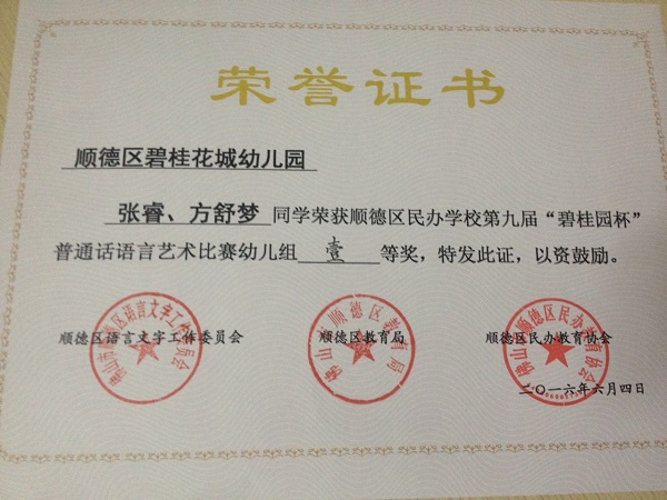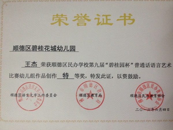 2016年6月4日,顺德区第九届“碧桂园杯”普通话语言艺术比赛在广东碧桂园学校拉开帷幕。由我园王杰老师创作的朗诵节目――《我有一个太空梦》代表碧桂花城幼儿园参赛。张睿、方舒梦两位小朋友的精彩表现给评委和现场观众留下了深刻的印象。最终,张睿、方舒梦小朋友荣获顺德区第九届“碧桂园杯”普通话语言艺术比赛幼儿组朗诵一等奖,王杰老师荣获创作特等奖,王杰、张嫣老师荣获优秀指导教师一等奖。取得如此优异的成绩离不开园领导对幼儿素质教育的重视,离不开指导教师的辛勤付出,更离不开两位小朋友的刻苦训练,再次向他们表示祝贺。