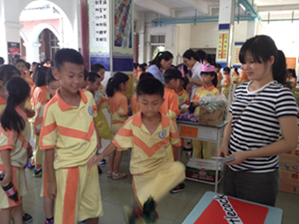 游戏有“画鼻子”、“跳绳”和“踢毽子”。孩子们很兴奋,积极地参与各种游戏,他们使出全身解数,运用在课堂上学到的英语知识完成游戏,赢取代金券。等代金券积累到一定数额后,再笑盈盈地走向琳琅满目的购物兑换区,购买自己心仪的商品。孩子们个个满载而归,快乐写在每一个人的脸上。