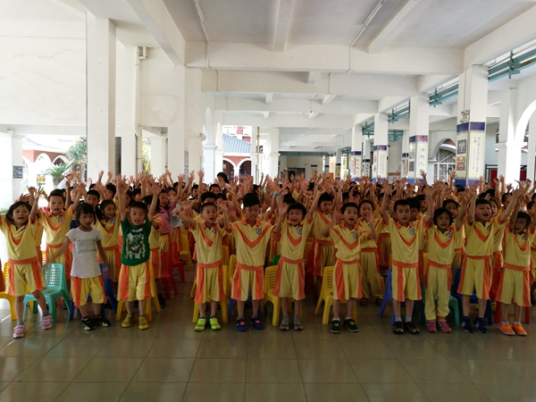 “If you’re happy ,and you know it ,clap your hands, if you’re happy, and you know it ,clap your hands…”这么欢快的歌声从哪里来?循声找去,原来是一年级的小朋友们在楼下大厅举行英语歌曲秀呢!