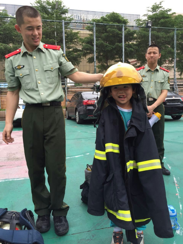 讲解过后,消防叔叔开始示范如何穿消防衣,原来消防衣可重了,整套装备有16公斤重。消防叔叔让孩子们亲身体验穿上消防服,你们看我多帅!长大后我也要当一名消防员!