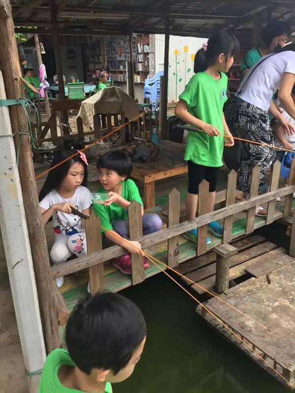 40分钟车程之后,一个安静舒适的安歇之地就展现在我们面前,小小农庄设施虽然简单,但很有特色,小丘上开了一块空地,建了个鱼塘,鱼塘四周绿树成荫,树荫下,一排排的桌椅随意摆放,人们可以打牌,可以聊天。那时有时无的桂花香,随着微风一阵阵甜腻腻地飘来。鱼塘边搭了几个大锅灶,几张桌子,可以自助烹饪,吃地道的农家菜。小屁孩们三五成群聚在一起,策划他们的游玩计划和安排,然后分头玩开了,他们或钓鱼、或喂兔子、或赶鸭子 ……平时活泼好动的奕昆居然能在鱼塘前坐上半天,享受姜太公之乐,嘉恩不厌其烦地采来鲜草喂兔子,靖意带着几个猫粉逗小猫……家长们也在一边聊天一边享受嘉桐妈妈带来的爱心蛋糕。