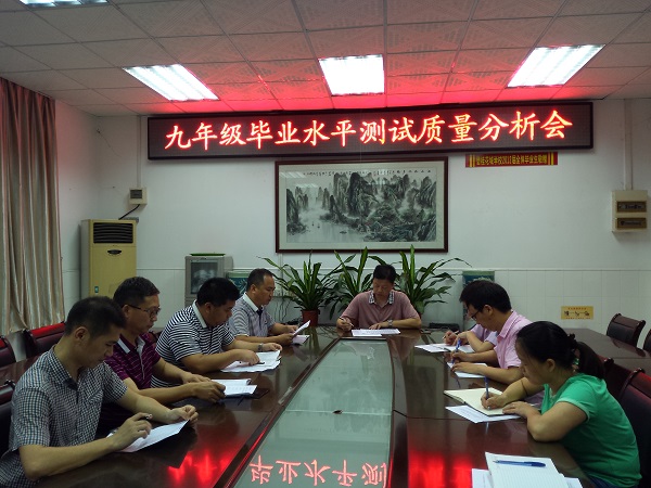 会议首先由年级组长欧阳老师代表九年级组向贺校长分析汇报了毕业水平测试的总体情况。接着,各科任老师分别就本学科具体情况作了详细的分析并提出最后复习阶段的计划和措施。