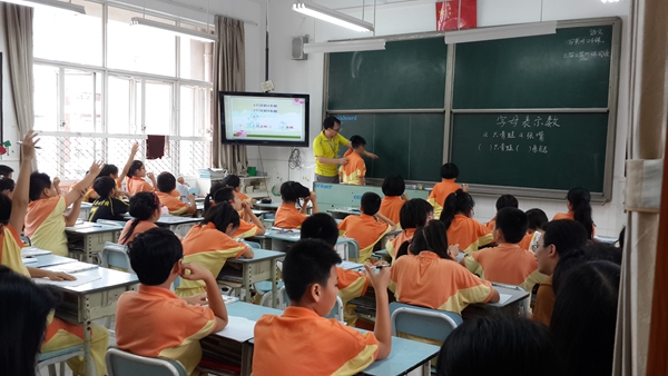 郑淑敏老师上了一节《用字母表示数》,教师从题目引入,学生勇敢提出质疑,为什么要用字母表示数?用字母表示数有什么作用?怎样用字母表示数出发?老师通过生动有趣的青蛙的儿歌,引出如何用一句话表达多少只青蛙多少张嘴、多少只眼睛、多少条腿等形式,学生自已思考,说出自已的想法并通过质疑、提问、解释、讨论等形式最终理解如何简便用字母表示数,学生大胆发言、敢于质疑,课堂气氛活跃。