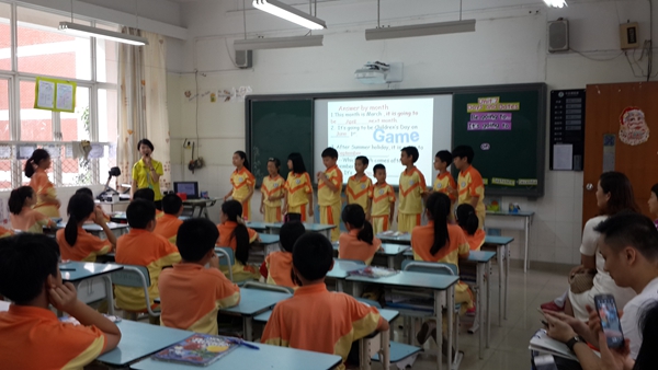吴敏映老师与四(1)全体同学为家长和来宾们展示了一节题为Unit7《Days and Dates》的听说展示课。本节课老师首先采取小组比赛的形式,引导学生对已经学过的be going to和12个月份以及每个月份的节日和习俗进行梳理复习。此环节展现了孩子们乐于在比拼中交流和学习。紧接着吴老师通过“Point and Say”的游戏。自然而然的引出句型“It’s going to be…on….””What are you going to do on…?” 和“When is going be….?”,对于听力材料的处理,主要采取的是思维导图和任务型教学:听了之后回答出来,读了之后写下来,写了之后说出来。就这样孩子们在老师由易到难,层层递进的引导下,学生学会了运用主要的句式,进而吴老师组织以小组合作的方式巧妙地运用”holidays”和“be going to”编成有趣的对话,使得学生学会了在玩中学。老师的步步引领,学生们的乐于表达,赢得了家长们的声声赞誉。