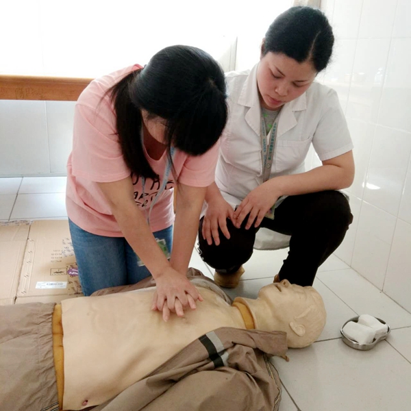 在“现场演练”环节,洪医生用人体模型进行了同步演示,从评估环境开始对各个操作要领进行逐一讲解并实践。在洪医生的指导下,生活指导老师们依次上台进行了心脏复苏的模拟实践,大家相互观摩,并指出操作中的失误,一起讨论改进。