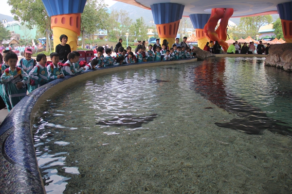 3月29日8:30,28个班级的1100名师生分别乘坐24辆旅游大巴出发了,他们一路欢歌一路笑语,不知不觉就来到了目的地。特别幸运的是,这一天恰逢景区的两周年志庆。景区处处装饰一新,各种巡游接连不断。年龄偏小的低段孩子在老师的组织下,排着队开始了海底世界的神秘之旅,无论是珍稀的海洋动物及其表演,还是世界最庞大的海洋主题花车巡游阵容、新奇的大型演艺,都让孩子们兴奋不已。高段与初中的孩子,除了与各类可爱的海底动物进行了亲密接触,欣赏了各种精彩的表演,还玩起了全球首创的大型游乐设施,如亚洲第一台水上过山车,激流勇进、海底互动船等,欢笑、尖叫声不绝于耳,孩子们在观赏游玩美景时,身心得到了彻底的放松。