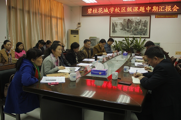 2015年12月18日下午三点,在碧桂花城学校会议室举行了五项区级课题的中期汇报会。参加会议的专家领导有:区教育发展中心张峰主任、唐信焱秘书长、唐麒老师、王萍老师、曾智品老师。镇教育局罗永棠局长、教研室李学英主任、何紫贤副主任。学校领导有:贺校长、谭副校长、夏娟副主任。会议由夏娟副主任主持。