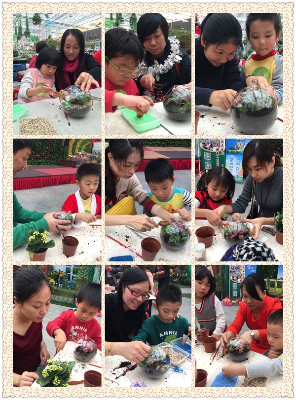 休息片刻之后,活动主持人带来了“认识植物,有奖问答”活动,宝贝们积极回答问题,认真学习如何照顾不同的植物。接着园艺师姐姐现场讲解创意玻璃微景盆栽种植步骤,宝贝们与爸爸妈妈一起动手操作,其乐无穷!