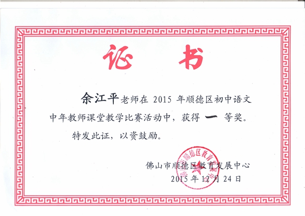 2015年12月23-24日,顺德区初中语文中青年教师课堂教学大赛在广东省顺德区德胜学校隆重举行。佛山市顺德区碧桂花城学校余江平老师表现出色,他执教的散文《列夫托尔斯泰》倍受评委认可,荣获一等奖。
