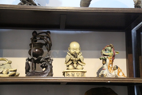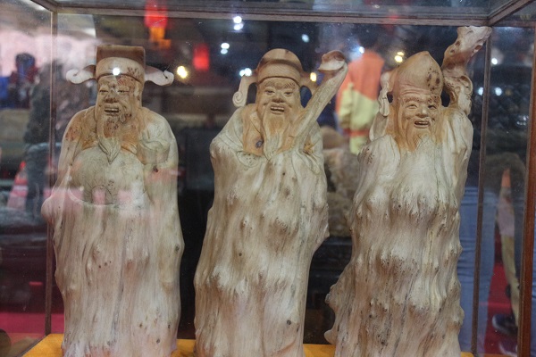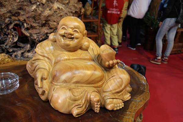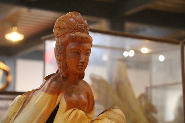 继续往前走,引入眼帘的是一件件雕刻精致的木雕,特别是被称为千年香柏的木雕作品使我爱不释手。走近这件木雕作品,一股浓郁的木香味扑鼻而来。这件木雕作品雕刻的很细致,无论是人物,还是动物,都雕刻得栩栩如生,从浓密的松树丛到江河里那波涛汹涌的江水,都是那么惟妙惟肖,像真的一样。