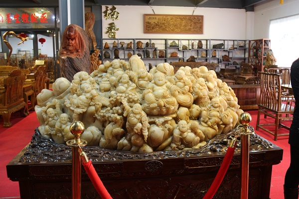 走进艺博馆,我不由得发出惊叹:这里的藏品真多啊,据说接近一千件,而李满先生自己个人的藏品更是多达八万件,只有其中的一小部分被放进这个艺博馆供人们观赏。馆内一排排的展品后面有一块石头吸引了我,它的颜色并不太鲜艳。李满先生告诉我们:这是一块内蒙古玛瑙,它并不是玛瑙中的极品。如果这块玛瑙石上布满一颗颗葡萄状的斑点,那它的价值至少可以超过一个亿,可惜,它上面没有葡萄状的斑点,因此价值大大减少了。