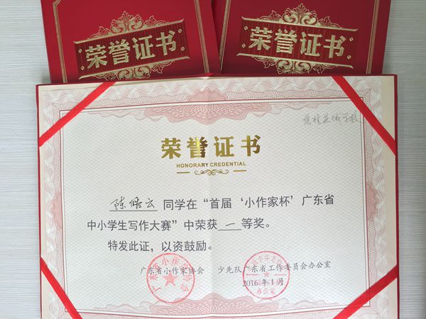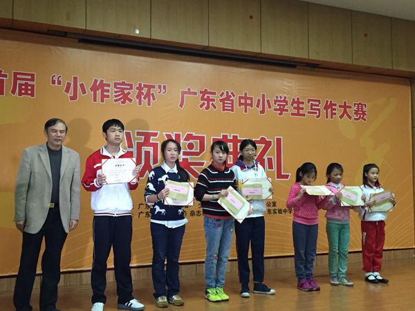 2016年1月10日,由省少工委办公室、省小作家协会联合主办的广东首届“小作家杯”中小学生现场作文大赛在广东实验中学隆重举行,来自全省近20个地级市的241名中小学生进行了两个半小时的现场作文角逐。本届写作大赛聚焦“民族复兴中国梦”的主题,引导少年写作,引导少年文学健康发展。这是我省中小学生文学创作领域的一项盛事,也是全省青少年文学爱好者展示自我的舞台。我校八(2)班王瑶同学、五(4)班黎苑瑶同学、五(1)班陈皓云同学、三(2)班李静妍同学在初赛时表现突出,在全省10000多篇参赛作文中脱颖而出,受邀参加了此次现场作文大赛,最终,五(1)班陈皓云同学凭借巧妙的构思和优美的语言荣获一等奖(最高奖项),八(2)班王瑶同学荣获三等奖,五(4)班黎苑瑶同学和三(2)班李静妍同学获得优秀奖。这些成绩,是我校近年来一直着力打造的读写特色的硕果之一。相信随着读写特色的进一步开展,学生的人生之路会硕果累累。