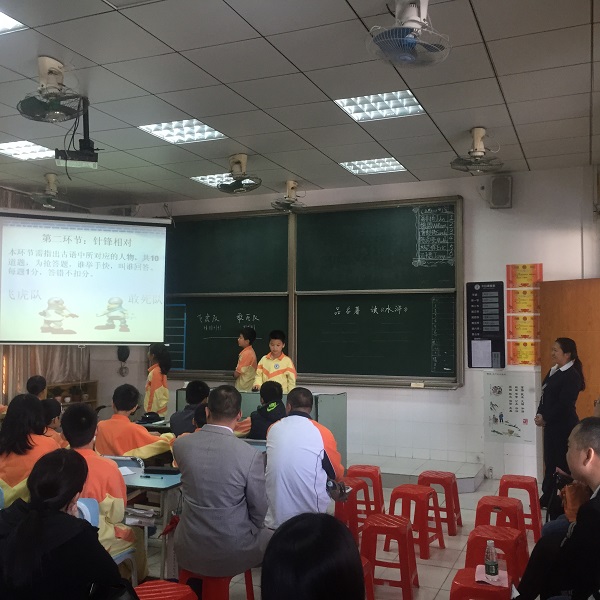 田桂花老师和黎梅峰老师上的是《读名著,品水浒》。这堂课的第一个环节是水浒知识竞赛,这既点燃了学生们学习的热情,又让老师初步了解了学情。然后把思考交流的主动权交给学生,让他们谈谈对“好汉”的理解,进而引入本堂课的重点,品析《林冲棒打洪教头》。这个部分是层次递进的,先设置冲突,让学生说说柴进、林冲、洪教头谁是好汉,并说出理由。大部分同学选择林冲,这都在老师的预料之中,但老师没有过多点评,引导抓住洪教头的冷笑和林冲的“不敢,不敢”进行品读,读出了林冲的隐忍,继续揣摩咀嚼,忍了这么久的林冲最后为什么还是“棒打洪教头”?最后老师带领学生们品悟出了人物丰富的内心世界和性格特点。