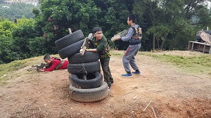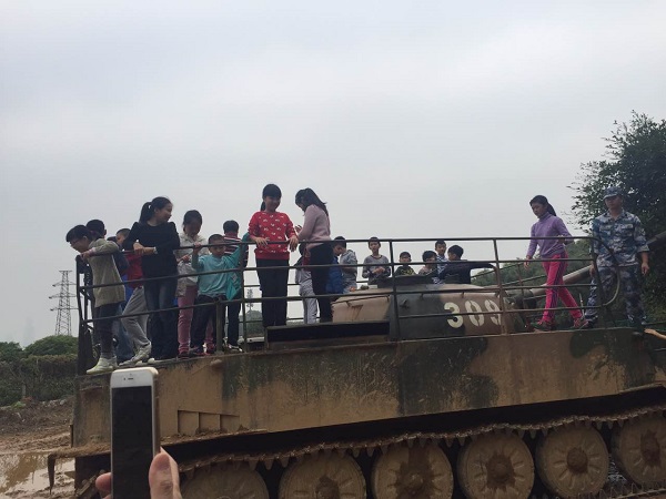 第一个环节是组建团队。在教官的指引下所有家长和孩子分别排成四列,后面的人根据口令为前一个人揉揉肩、捶捶背,这一小小的动作拉近了人与人之间的距离,让大家很快地融合起来。接着很顺利组建了团队,并给队伍取了名字,制定了口号,然后排成整齐的队伍去乘坐水陆两栖坦克。一路的颠簸,坦克的轰鸣,让大家感受到了铁甲雄风。