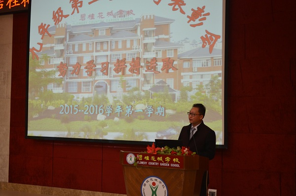 12月16日晚上6点40分,九年级全体师生在学术报告厅召开了本学期第二次月考总结表彰大会,会议由张明领老师主持,谭家文副校长出席会议并作了重要讲话。