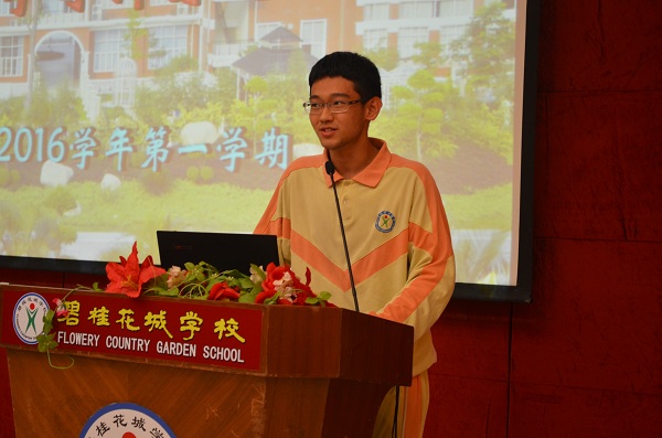 学生代表沈书宇在本次检测中获得总分第一名的好成绩,他在发言中给同学们介绍了自己在学习中的心得体会,呼吁同学们学习中既要明确目标,又要放下包袱。