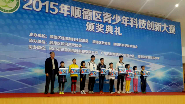 2015年顺德区青少年创新大赛12月5日在伦教翁佑中学进行了颁奖大会,我校陈誉同学代表碧桂花城学校获奖的同学上台领奖。