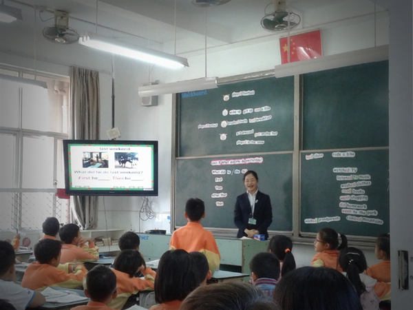 四(2)班Miss Huang上的课题是: What did you do yesterday? 通过学习副词First, then, after that, then,口头和笔头描述个人过去的日常生活。例如:Last Sunday, first, I woke up and got up. Then I brushed my teeth and washed my face. After that...课堂在热身和复习环节后,首先通过喜洋洋系列动画,引出了情景;随后的练习环节,换上了班上几个同学,在不同的时间段,他们的日常生活,例如:yesterday, last Tuesday, last weekend. 同学们将在前一环节所学到的知识,迅速运用到本环节,成功把同学的日常生活,用四个副词形成结构,描述出来。同样地,他们也能利用问答句型“What did you do last Sunday?” “First I, then I, after that I, then I...” 出色地完成小组内对其他同学过往的日常生活中的小调查。