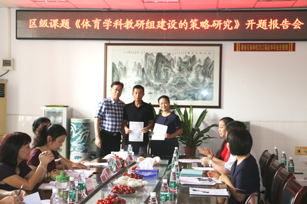 谭家文校长对开题报告会做了总结和讲话,他指出,我校一直本着“科研兴校”的原则,大力支持教师的教科研工作,为教师寻找到更多专业渠道来提升教师的业务能力和水平,并希望教研要深度化,营造浓厚的教科研氛围,对已经取得的成果要及时推广,形成品牌,加强与外界的交流。最后,谭校长对我校体育科组也寄予厚望,期待四位体育教师团结一致、加强教科研的创新,紧跟学校教育理念,提高自己的业务技能,为学校的发展贡献力量。