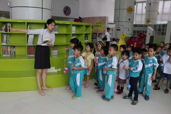 一下车,孩子们就被高大的建筑物所吸引,纷纷发出惊叹声,眼前这座崭新的富有时尚感的建筑物就是佛山新城图书馆。去年年底才正式开放,共有七层楼,包括报刊阅览区、报告厅、视障人士阅览区、少儿阅读乐园、自助图书馆及新技术体验区等不同片区,满足不同人士对知识的渴求。而今天我们要参观的就是“少儿阅读乐园”,少儿部的刘老师热情地为孩子们介绍“少儿阅读乐园”的概况,阅读规则等。让人欣喜的是,刚才还在馆外兴奋惊叹的孩子们,进入了图书馆后,都自觉地轻声说话,慢慢走路,孩子们已经感受并融入这浓厚的书香氛围。