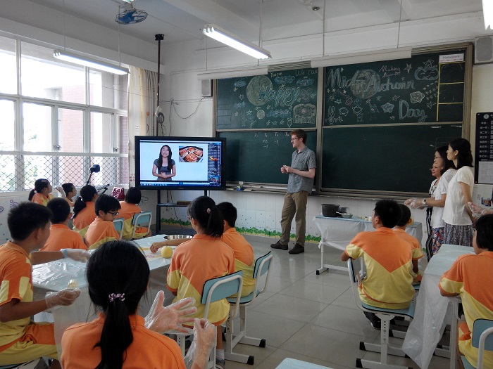 活动于上午10点准时开始。首先,在各位靓妈们的指导和带领下,孩子们做好了一切准备工作:教室黑板海报设计,分组分派原材料等。接着,外教Dr Jonathon通过视频向大家展示了各种月饼的原材料以及他们的英文说法,图文并茂,让孩子们对平时吃过的月饼有了更进一步的了解。看着视频中各式月饼,孩子们都垂涎欲滴了。别慌,孩子们,咱们待会儿自己也做好吃的月饼。紧接着由家长代表张天俊妈妈示范制作过程,黄弈谦妈妈介绍组成原料和制作步骤。先把做面皮的面团在秤上称重25g,沾上少许面粉,揉成饼状。随后把妈妈们备好的馅儿称重25g,像包包子一样裹住里面馅料。包好后就可以把它放进带有花纹的模具中,这样中秋月饼就“诞生”了。讲解和示范完成之后,孩子们分组自己动手,亲自操作,在这个过程中他们互相帮助,分工协作,很好地完成了冰皮月饼的制作。有的“快手”同学在短短的时间内完成了十多个月饼的制作。他们将把自己亲手制作的月饼与家人,老师和朋友们一起分享。最后是制作活动总结和分享环节,外教引导孩子们用英文描述制作过程,孩子们用Poster海报的形式展示自己对中秋节的理解,真正体现了孩子们在体验中学习的教育理念。