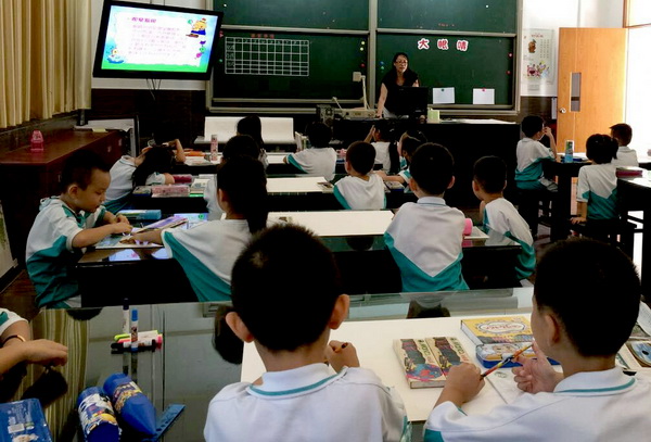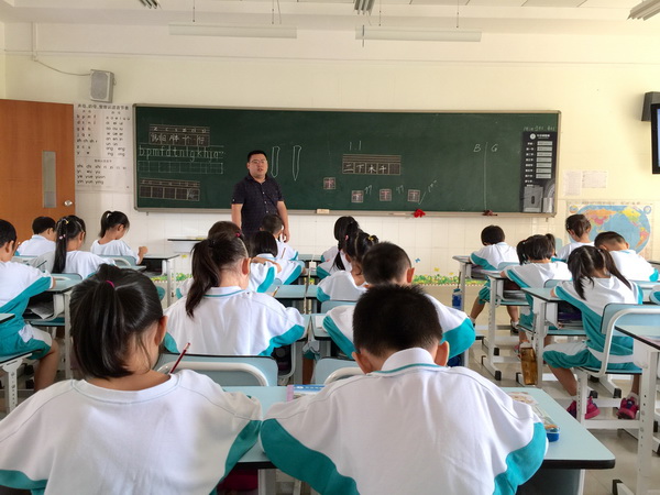 张峰老师讲授的是一年级写字课,课堂开始就强调正确的坐姿和标准的握笔姿势,接着是复习短横和长横,张老师用“下”字带入新课“竖”,并把“竖”分成悬针竖和垂露竖,通过示范把“竖”清晰地演示并讲解,学生通过练习、评讲进行深入的理解。