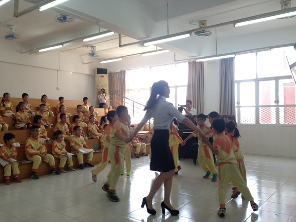 活动在我校优秀音乐教师彭金婷老师执教的精彩音乐课――《洋娃娃和小熊跳舞》中拉开序幕。彭老师以生动有趣的故事导入课题,激发学生们的兴趣,并通过一系列的图谱训练、节奏练习,引导学生进入音乐世界。教唱环节中,学生勇敢表达,演唱出彩,而最后的设计情景让学生自主创编环节,更让来宾充分感受了花城学子的创造力和想象力。课堂最终在愉悦轻松的氛围中结束。彭老师独特的教学风格,赢得了来宾的一致好评。在课后的教师课堂交流会上,教育专家们对这堂展示课赞不绝口。