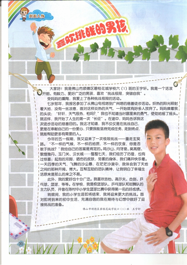 大家好!我是佛山市顺德区碧桂花城学校六(1)班的王宇轩。我是一个活泼开朗、有毅力、爱好广泛的男孩,喜欢“挑战极限,突破自我”。